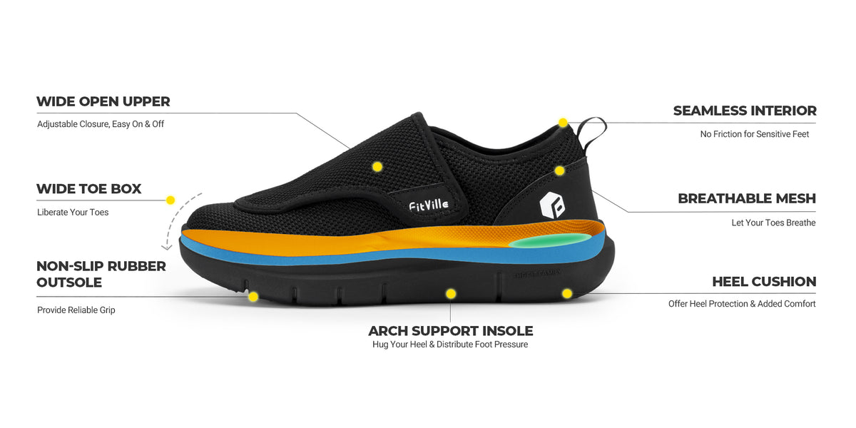 Explore Shoe Collection: Wide toe box, adjustable Velcro for swollen feet, seamless interior, non-slip outsole, breathable mesh upper, arch support insole, and padded collar ensure unmatched comfort and support.